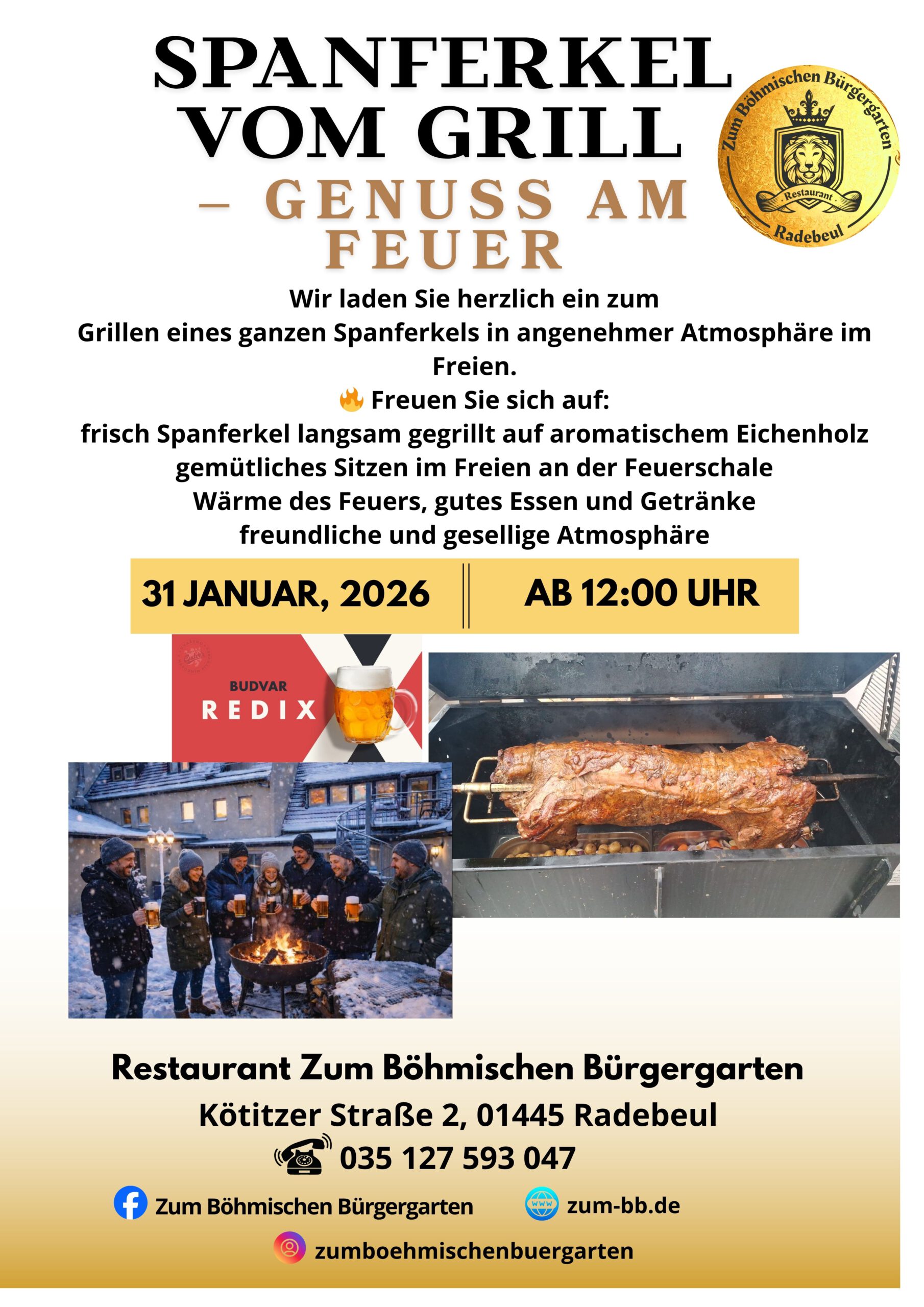 Wir laden euch herzlich zu unserem winterlichen Spanferkel-Grillen auf der Außenterrasse ein.