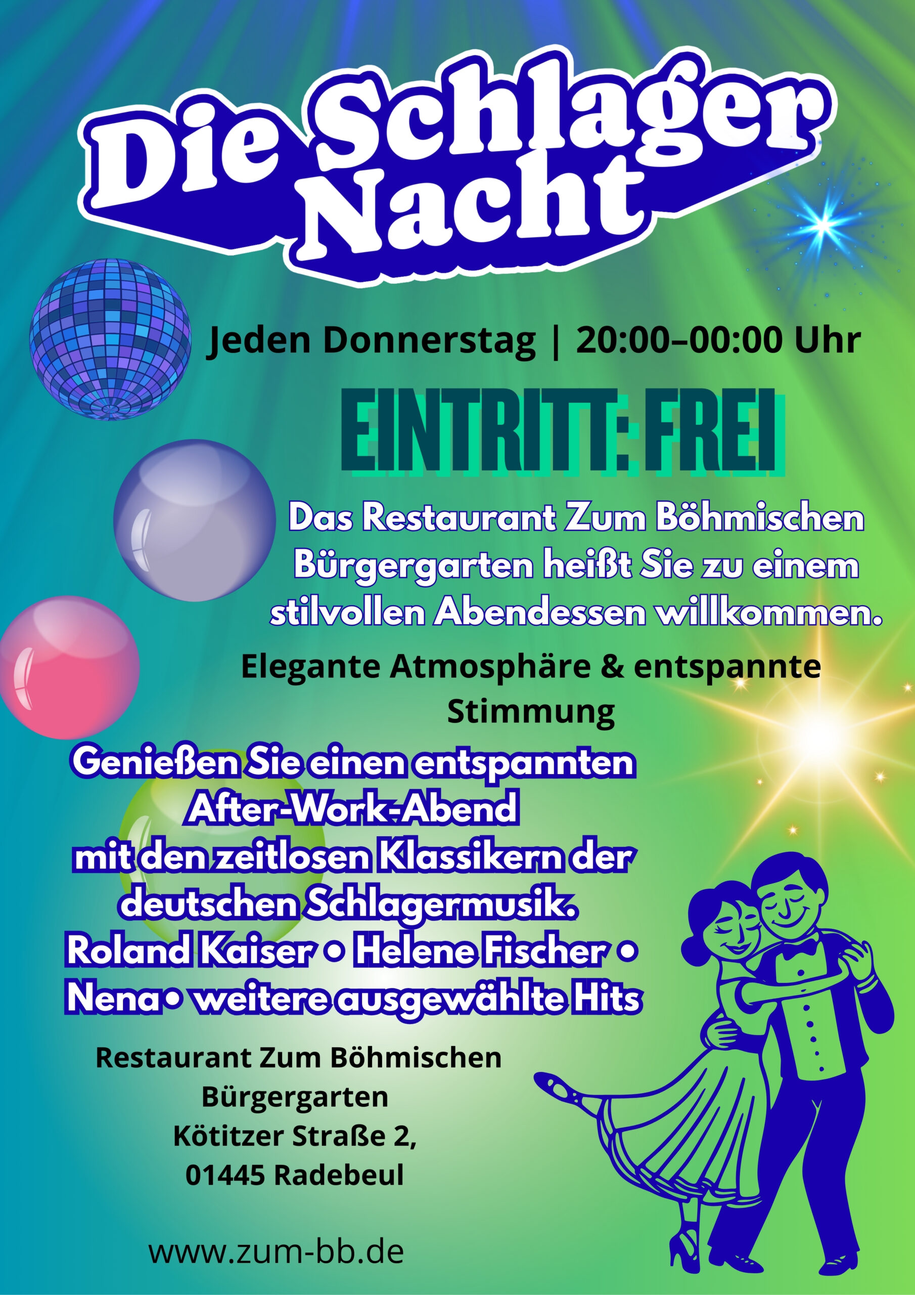 Genießen Sie einen stilvollen After-Work-Abend mit den beliebtesten Klassikern des deutschen Schlagers. Entspannte Atmosphäre, gute Musik und bester Genuss erwarten Sie.Jeden Donnerstag | 20:00–00:00 Uhr |